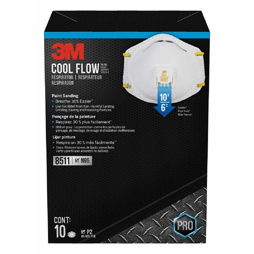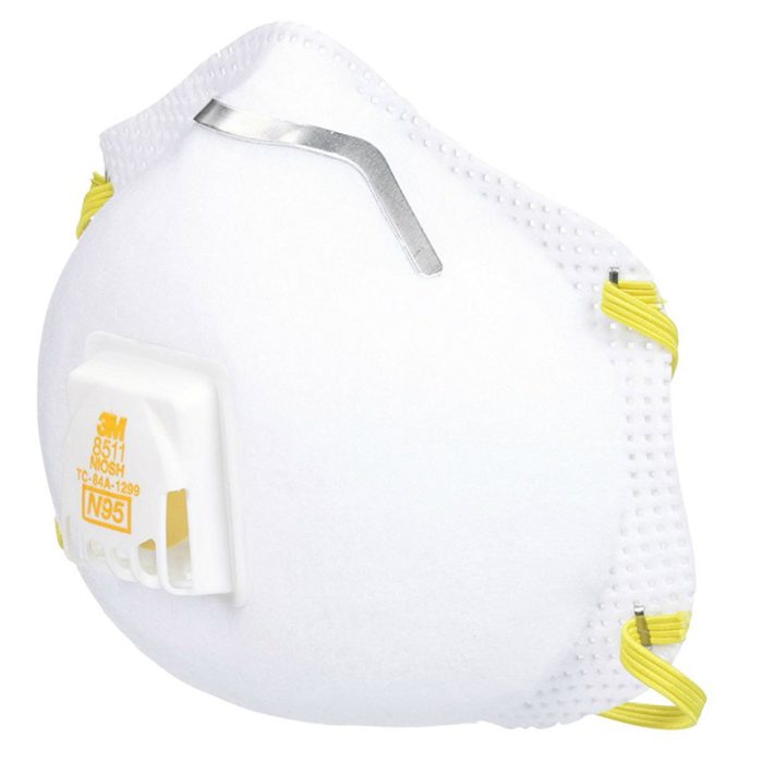 3M™ Particulate Respirator 8511, N95 is a disposable particulate respirator that is designed to help provide reliable respiratory protection of at least 95 percent filtration efficiency against certain non-oil based particles. The respirator is designed for use for particles such as those from grinding, sanding, sweeping, sawing, bagging, or other dusty operations. This respirator can also help reduce inhalation exposures to certain airborne biological particles (examples: mold, Bacillus anthracis, Mycobacterium tuberculosis), but cannot eliminate the risk of contracting infection, illness, or disease. Soft inner material provides added comfort while the cup shape design makes the respirator spacious and durable. Braided headbands and an adjustable M nose clip helps provide a custom and secure seal. The respirator incorporates 3M’s proprietary technology with advanced electrostatically charged microfiber filter media designed for ease of breathing. This respirator is compatible with a variety of protective eyewear and hearing protection. Fitted with a 3M Cool Flow™ Exhalation Valve, this respirator is ideally suited for work situations involving heat, humidity, or long periods of wear. The proprietary 3M Cool Flow valve is designed to release hot, humid exhaled breath quickly, helping to prevent an unpleasant build-up of heat inside the facepiece a significant cause of discomfort to respirator wearers. The Cool Flow valve’s efficiency in keeping breathing cool and comfortable has been demonstrated through testing*: the atmosphere inside a respirator with a Cool Flow valve is on average 7.5°F cooler than a similar product without the valve. This makes Cool Flow valve respirators ideal for long periods of wear, especially where conditions are hot, humid or physically demanding. *Testing conducted in a 3M laboratory. Testing protocol, data generation and conclusions were reviewed and approved by an expert from The University of Minnesota