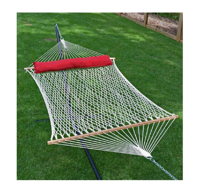 Highlights:Hammock Material: CottonWidth: 59 inchLength: 82 feetPillow Included: YesWeight Capacity: 375Double size cotton rope hammock bed13ft overal