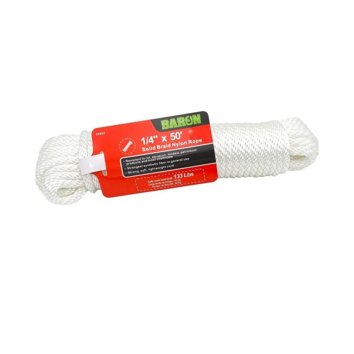 Highlights:Color: WhiteMaterial: NylonDiameter: 1/4 inchLength: 50 feetRope Construction: Smooth BraidedWorking Load Limit: 90 lbs