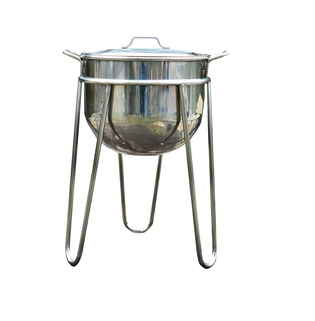 Highlights:Capacity : 15 GallonMaterial : Stainless SteelCover Type : Lid24-1/2 inch welded stainless standRounded bottom kettleVented lid with hanger