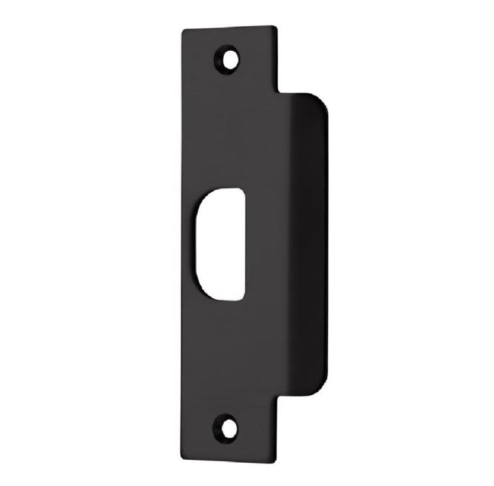 The strike plate is steel constructed and helps keep the door closed by catching the latch mechanism and reinforcing security to the door