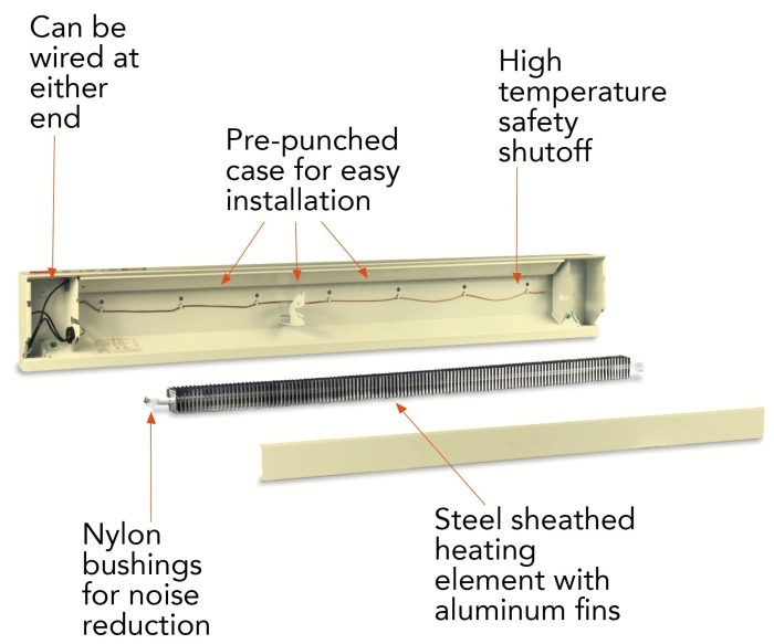 Electric baseboard heaters uses convection to circulate air. By superior design and proper placement under a window area, the electric baseboard case causes air to flow naturally. The cold air falls from the window area as the warm air rises from the heater, causing the air to tumble gently throughout the room. The electric baseboard heater is the number one choice for low cost installation, and the quiet operation makes it the preferred heater for bedrooms.A matching single or double pole thermostat is available to install into either end of the baseboard heater. Since an electrical outlet may not be installed above a heater, use a duplex outlet (BRF12) in either end of the baseboard. To switch between the baseboard heater and a cooling unit, the LTF240 can be utilized. Inside corner connectors are available to fit various designs, such as corner window areas. All baseboard heaters require a thermostat. An optional MTX mounting tool is helpful for installing the heater.