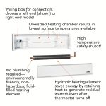 Cadet’s premier hydronic baseboard line is recommended for nurseries and bedrooms, and for people with severe allergies. While Softheat offers everyone a comfortably warm room, it was specifically designed to reduce the effects of indoor allergens, compared to other heating systems. Additional benefits include lower operating and surface temperatures and whisper quiet operation. The Softheat hydronic baseboard uses circulating fluid (80% water and 20% Ethylene Glycol) to provide steady, uniform warmth with longer heat retention and minimal temperature variation. No plumbing necessary! Cadet recommends a wall-mounted thermostat for optimum performance, or you may prefer the convenience of an optional field mount thermostat kit (Left end wiring only).