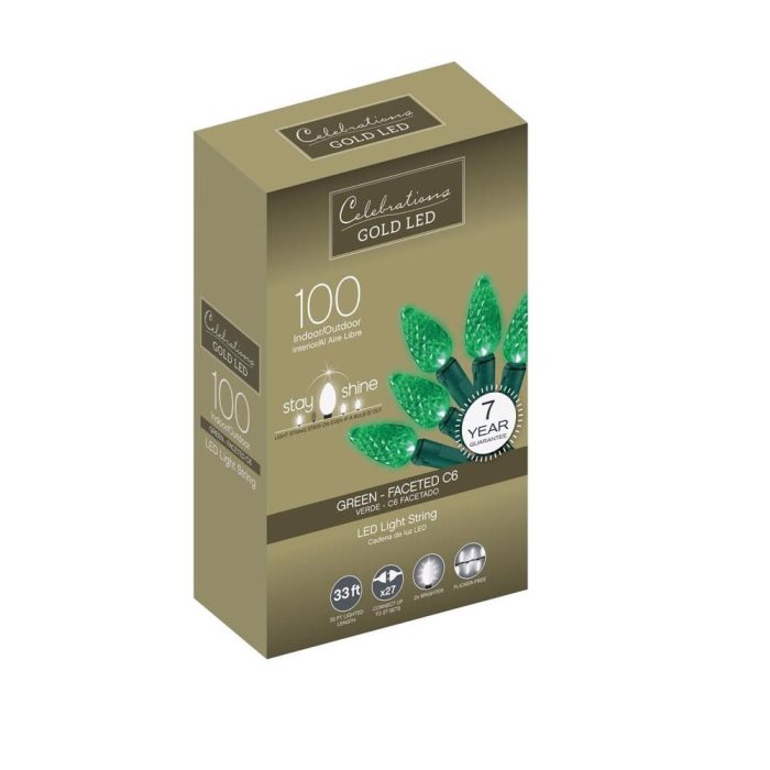 Highlights:Power Type: LEDBulb Type: C6Bulb Color: GreenBulb Count: 100 ctLight Type: StringLighted Length: 33 feetLight Features: ConstantMaximum Num