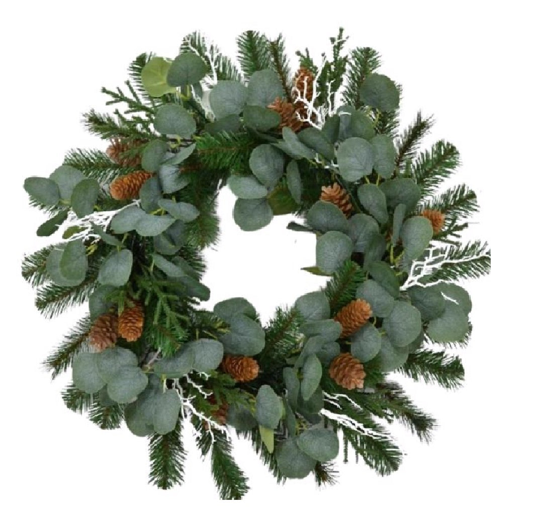 Highlights:Material: PE/PVCDiameter: 24 inchWreath Size: Small (<30 in)Light Features: UnlitFeatures eucalyptus leavesNo assembly required, just fl