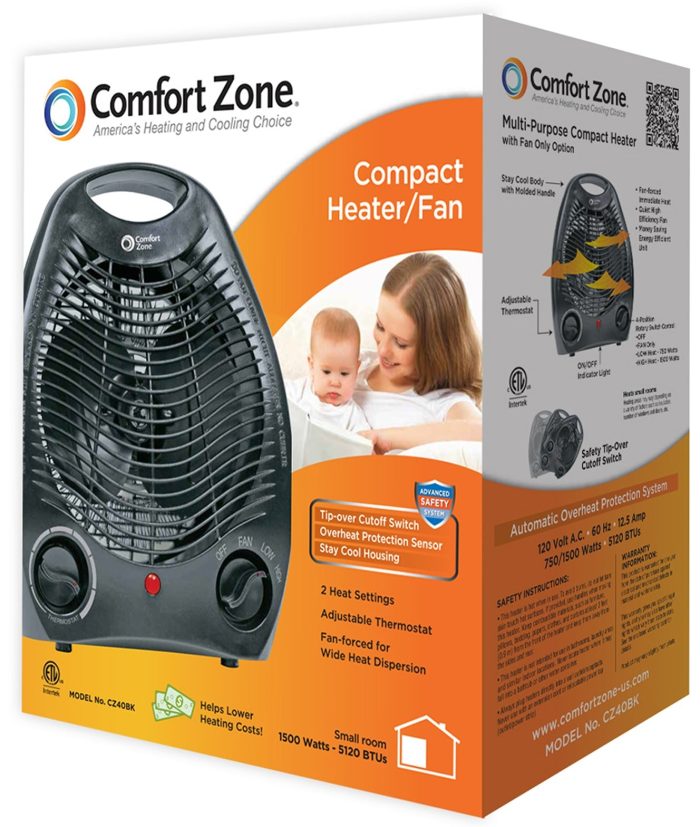 Comfort Zone CZ40BK Personal Fan Forced Heater, Black