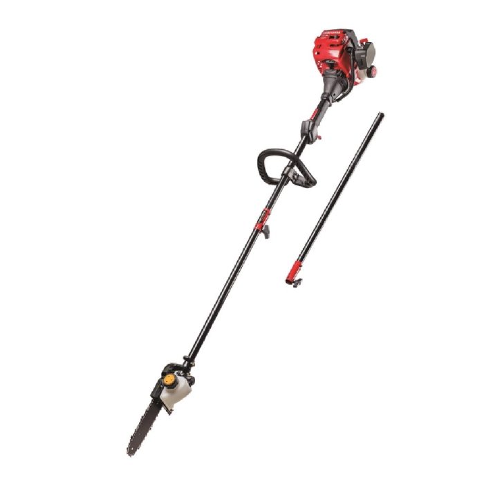 A 8-in bar and chain are mounted on a 7-foot extension pole, allowing the user to reach up to 12-ft (based on user height)