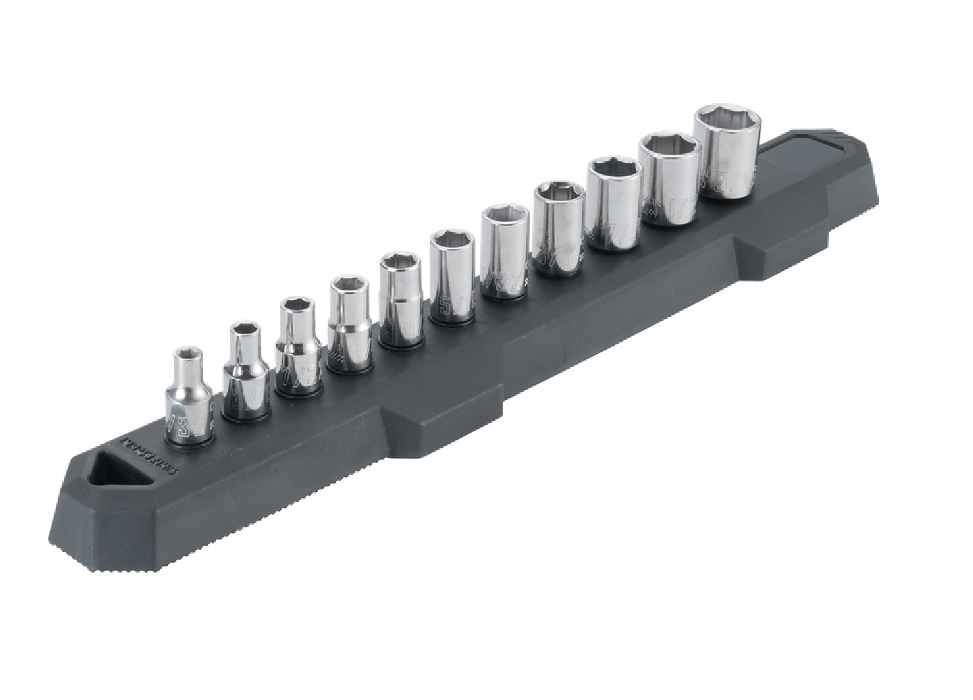 Included: (11) 1/4-inch Drive Shallow 6 PT Sockets SAE – 5/32-inch , 3/16-inch ,7/32-inch, 1/4-inch , 9/32-inch , 5/16-inch , 11/32-inch , 3/8-inch , 7/16-inch , 1/2, 9/16-inch