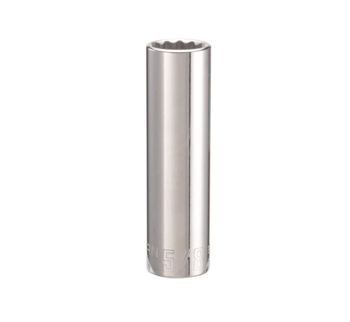 Highlights:Socket Size : 5/8 inchDrive Size : 1/2 inch driveMetric or SAE : SAENumber of Points : 12 PointStyle : DeepFinish : Polished ChromeMaterial