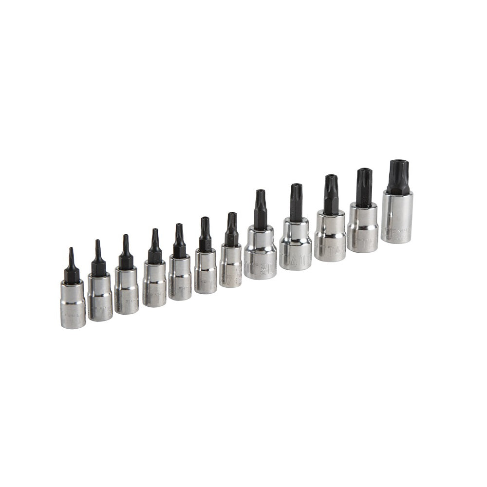 Set Includes: (7) 1/4 inch drive bit sockets – T7, T8, T10, T15, T20, T25 and T27 and (5) 3/8 inch Drive Bit Sockets – T30, T40, T45, T50 and T55