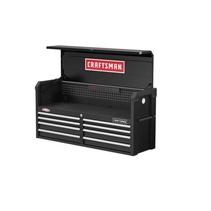 Quick access to the charging area with gas struts that support the tool chest lid