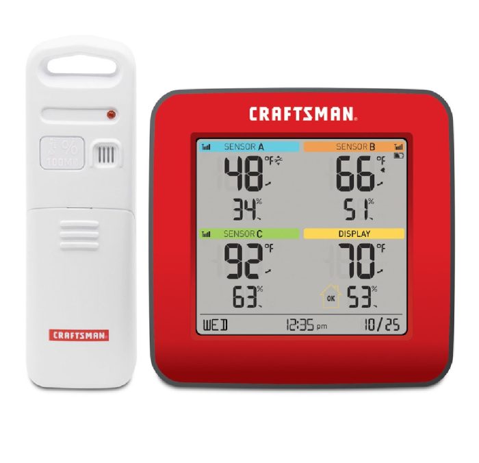 Three weather-resistant wireless temperature and humidity sensors provide measurements for additional areas, such as a bedroom, kitchen, basement, office or yard