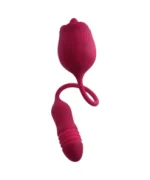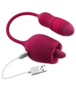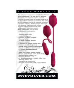 Two unique sensations connect with a flexible cord in this extraordinary toy that delivers delicious pleasure in two exquisite ways! A textured, vibrating, thrusting bullet on one end ramps up to 10 speeds for a surprising spontaneous feel, while the velvet-smooth rose at the other end surrounds a 10-speed vibrating, flicking tongue that targets with intensity. Experience one feature at a time or both simultaneously with independently controlled motors. Water submersible, easy to clean, USB magnetic rechargeable, and a 5 year warranty!