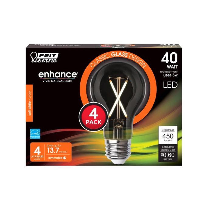 Feit Electric A1940CL950CAFL4 A19 Filament LED Bulb, 5 Watts $16.39 Original price was: $16.39.$8.20Current price is: $8.20.