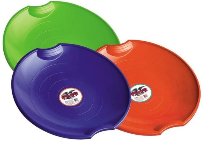 They glide smoothly across the snow whether it’s a child or adult rider! They are made of heavy guage injection molded high density polyethylene for durability. The saucers have molded hand grips to hold on tight.