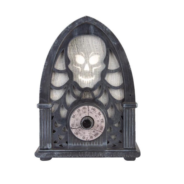 Highlights:Design: Haunted RadioWidth: 6 inchesLength: 9 inchesHeight: 5.7 inchHalloween Motif: Skeletons and BonesPower Source: Battery OperatedSkull