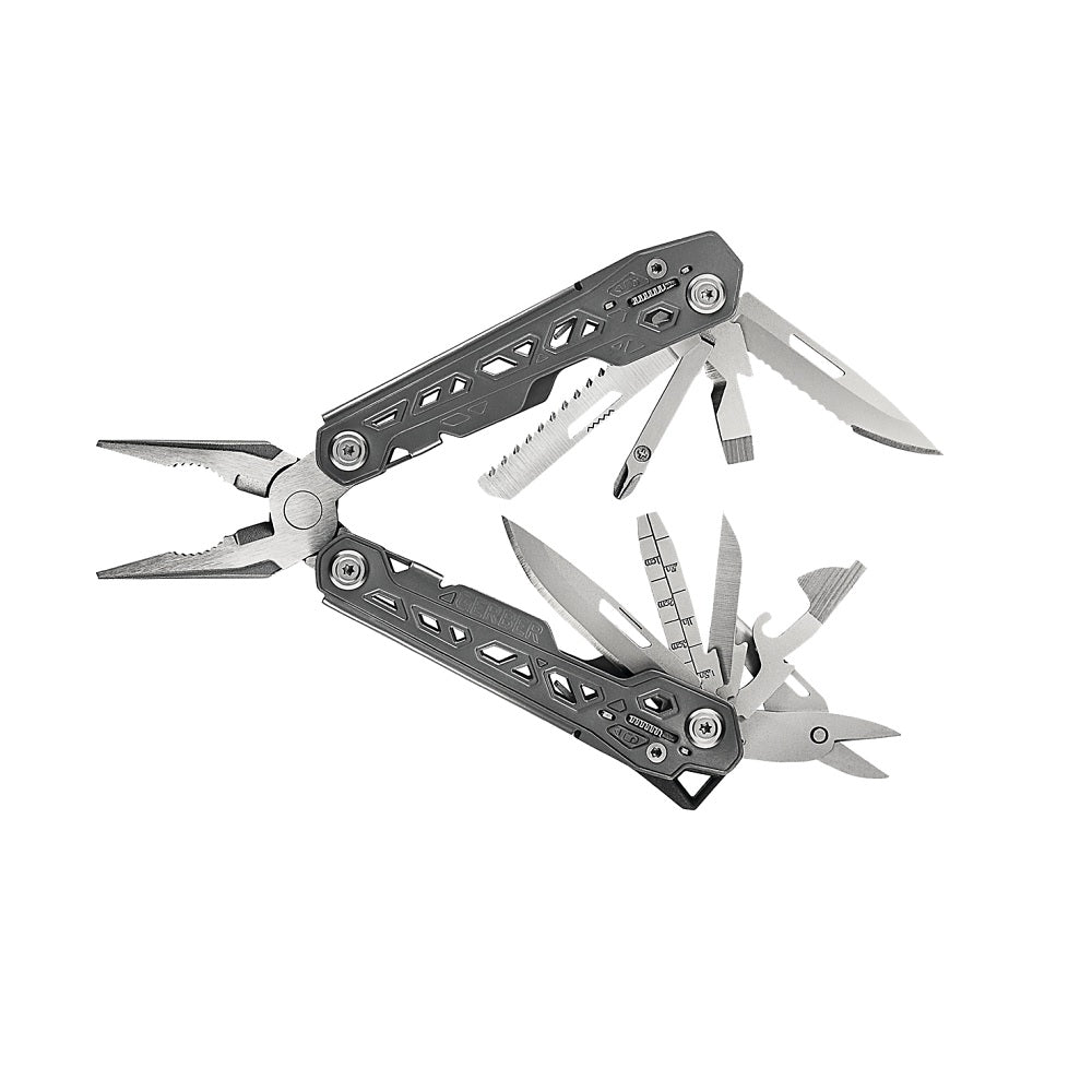 Includes: 2-1/4 Inch Plain Edge Blade, 2-1/4 Inch Serrated Edge Blade and Large Flathead Drivers, Awl Bottle Opener, Can Opener, File Medium Needle Nose Pliers, Real Cross Driver, Regular Pliers, Ruler Saw Scissors, Small Wire Cutter, Wire Stripper and Improved Sheath