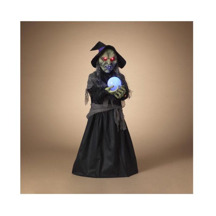 Highlights:Design: Lighted Animated WitchWidth: 15 inchLength: 13 inchHeight: 44 inchPower Source: Battery OperatedSpooky fun Halloween decorEyes and