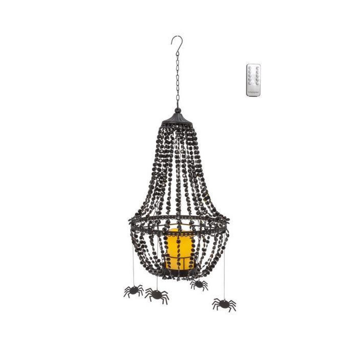 Highlights:Color: BlackDesign: Spider ChandelierWidth: 10.43 inchLength: 10.43 inchHalloween Motif: SpidersHeight: 25.2 inchPower Source: Battery Oper
