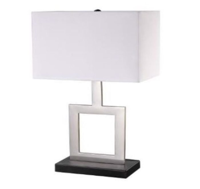 Highlights:Material: MetalWidth: 7.89 inchDepth: 12 inchHeight: 21 inchMaximum Bulb Wattage: 60 WWhite square shadeBrushed nickel finishBlack base