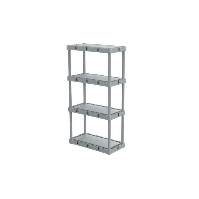 Highlights:Color: GrayHeight: 48 inchWidth: 24 inchDepth: 12 inchMaterial: PlasticPackaging Type: ShrinkwrappedNumber of Shelves: 4Weight Capacity: 22
