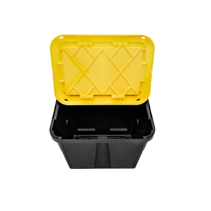 Highlights:Capacity: 12 gallonColor: Black/YellowHeight: 14.7 inchWidth: 15 inchDepth: 20.5 inchStackable: YesMaterial: PolypropyleneLid Included: Yes