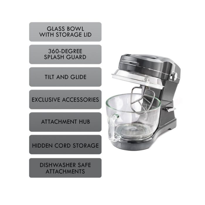 WHAT’S INCLUDED: Mixer Base With Pour-In Top, 5 Qt Glass Bowl with Handle, Snap-On Bowl Lid, 360-Degree Splash Guard, Flat Beater/Creamer, Wire Whisk, Dough Hook, Easy-Pour Funnel, Pour-in Egg Separator, Ingredient Grater/Zester