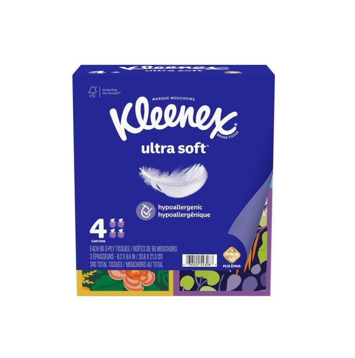 Highlights:Color: WhiteNumber of Tissues per Box: 60 ctNumber of Plys: 3 plyLength: 8.4 inchNumber in Package: 4 pkWidth: 8.2 inchCertified- Kleenex f