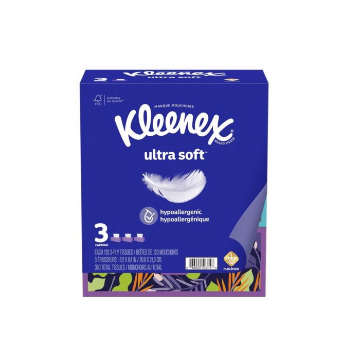Highlights:Color: WhiteNumber of Tissues per Box: 120 ctNumber of Plys: 3 plyLength: 8.4 inchNumber in Package: 3 pkWidth: 8.2 inchCertified- Kleenex