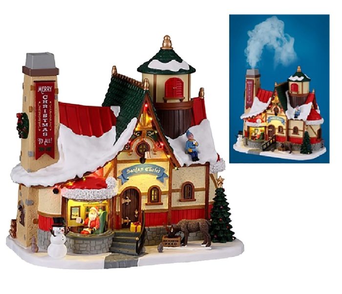 Here he is, folks, the man you have all been waiting to see! Santa looks incredibly cheerful and comfortable in his amazing chalet. With different color lights sparkling along the cornices, an illuminated Christmas tree, and smoke coming out through the chimney, this is deservedly one of the most impressive buildings in Santas Wonderland.