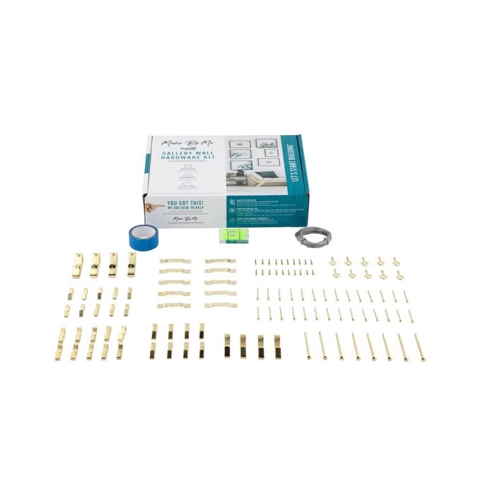 Gallery Wall Hardware Kit includes: 36 Picture Hangers, 10 Picture Hanger Screw Eyes, 10 Leveling Hangers, 8 Strands of 10FT Braided Wire, 1 Storage Container, 1 Painter’s Tape, and 1 Hanging Guide template