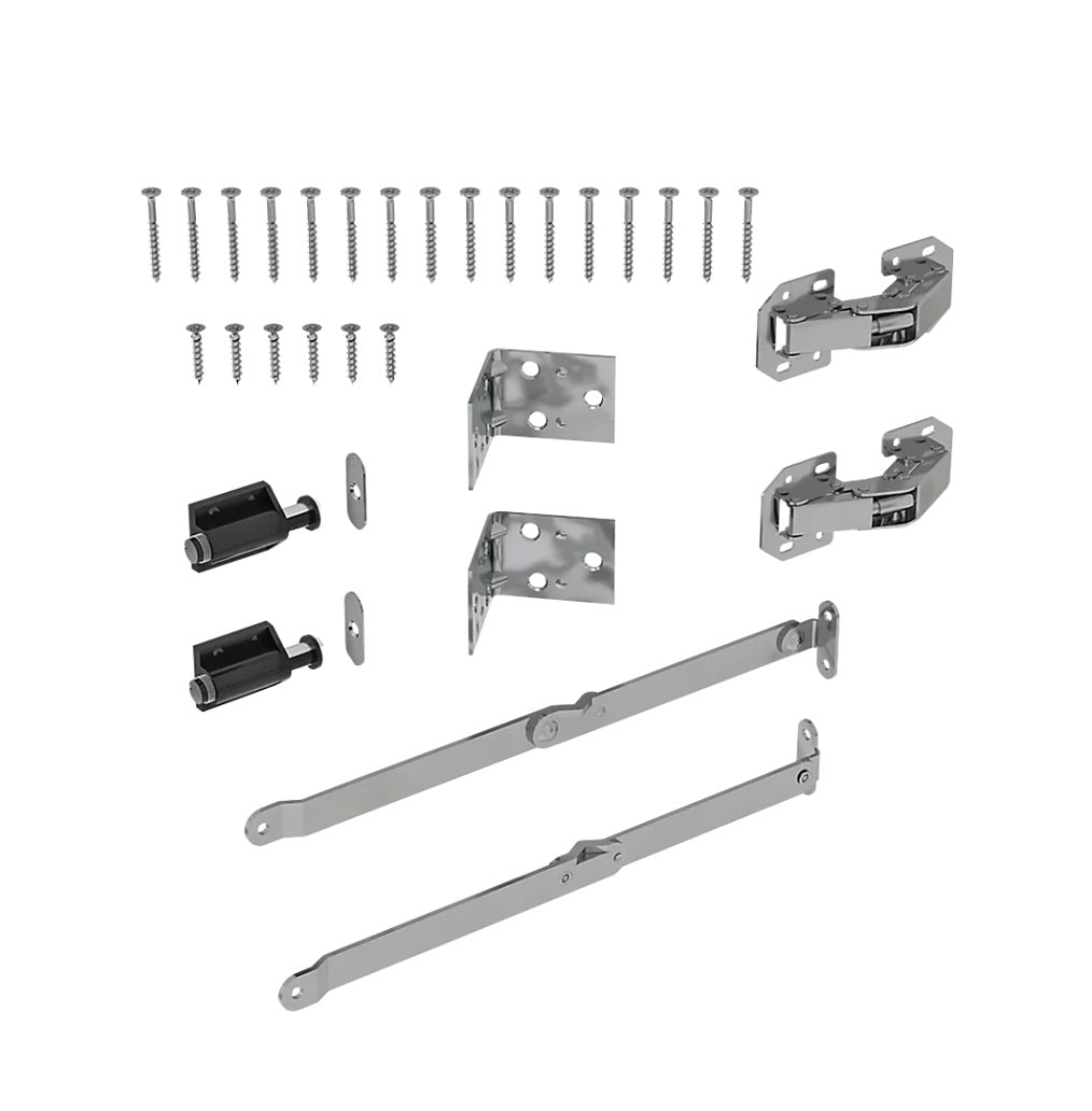 Includes : (18) Wood Screws (2) Magnetic Catches (2) Folding Support Arms (2) Hinges (2) Corner Braces and (6) Wall Mounting Screws