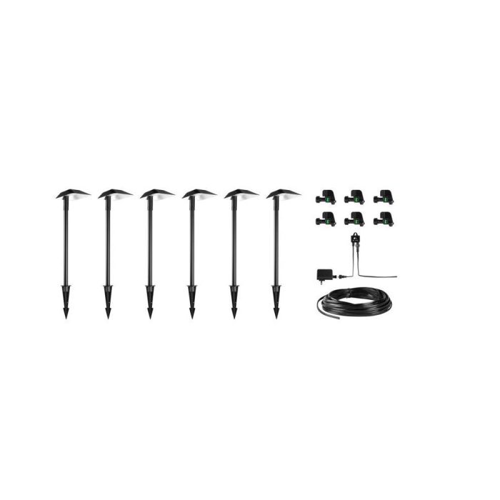 Included: 6 Path lights, 6 Connector Clips, 6 Ground Stakes, 22 Watts Transformer, 50 feet connection wire