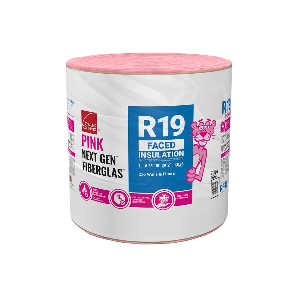 R-19 faced insulation roll, easy 2×6 wall and floor install