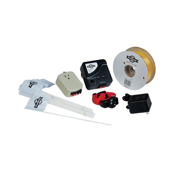 Included: (1) Transmitter, (1) Receiver Collar, (1) 500 Ft of Boundary Wire, (1) 50 Training Flags, (1) Mounting Hardware, Short and Long Contact Points, (1) Gel-filled Capsules, (1) Wire Connectors, (1) Transmitter Power Adaptor, (1) Receiver Collar Charging Cable