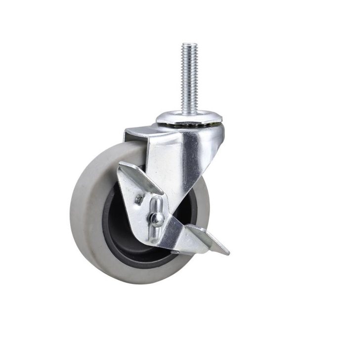 3 Inch diameter gray thermoplastic rubber wheel over black polypropylene hub with ball bearing swivel, threaded stem and side brake