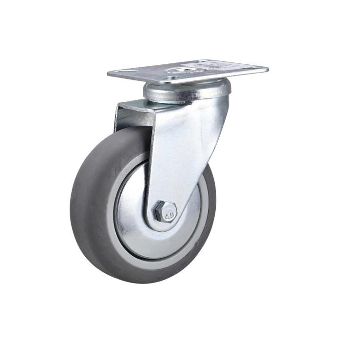 3 Inch diameter gray thermoplastic rubber wheel over black polypropylene hub with ball bearing swivel and plate mount