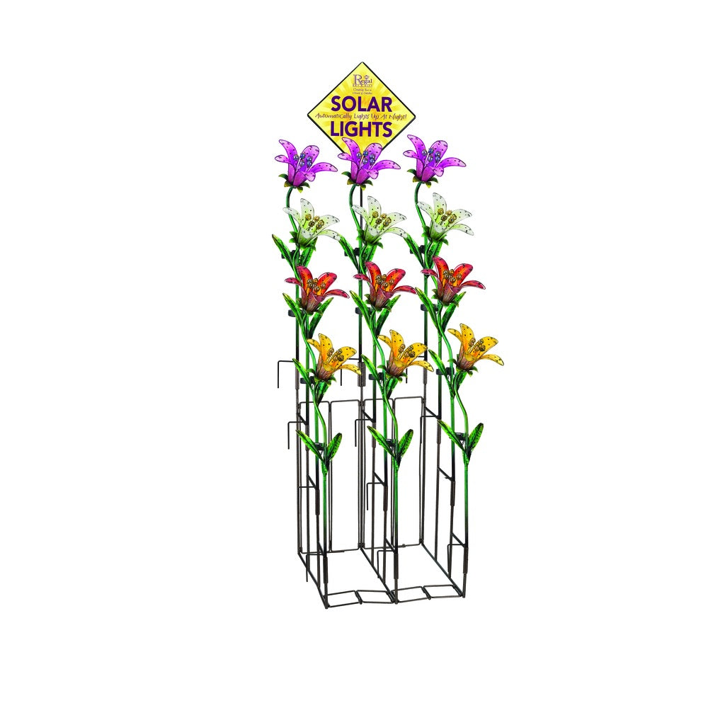 Highlights:Color: AssortedMaterial: Glass/MetalHeight: 33 InchDesign: Tiger LilyLength: 9 InchWidth: 7.25 InchBattery Size: AAABattery Type: Ni-CadPac