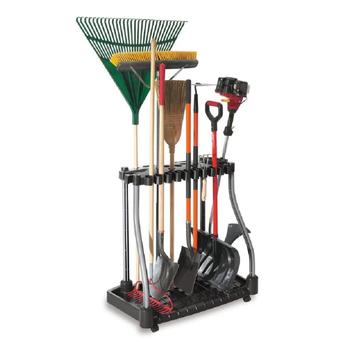 The tool tower stores rakes, brooms, snow shovels and gas-powered weed eaters