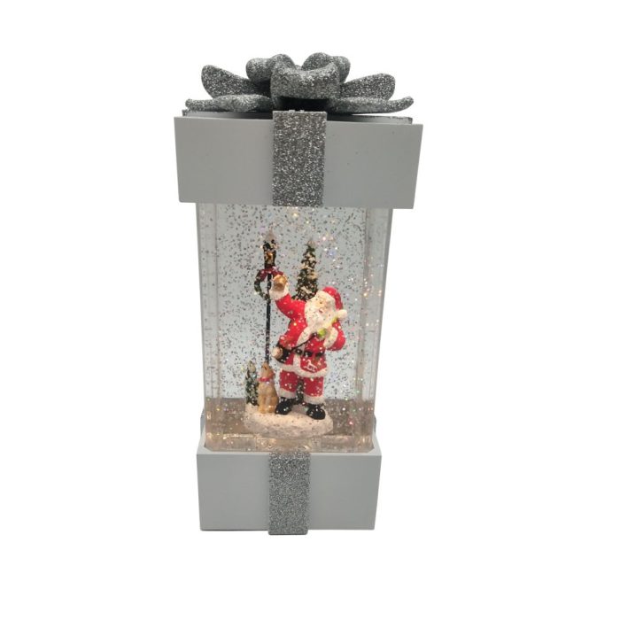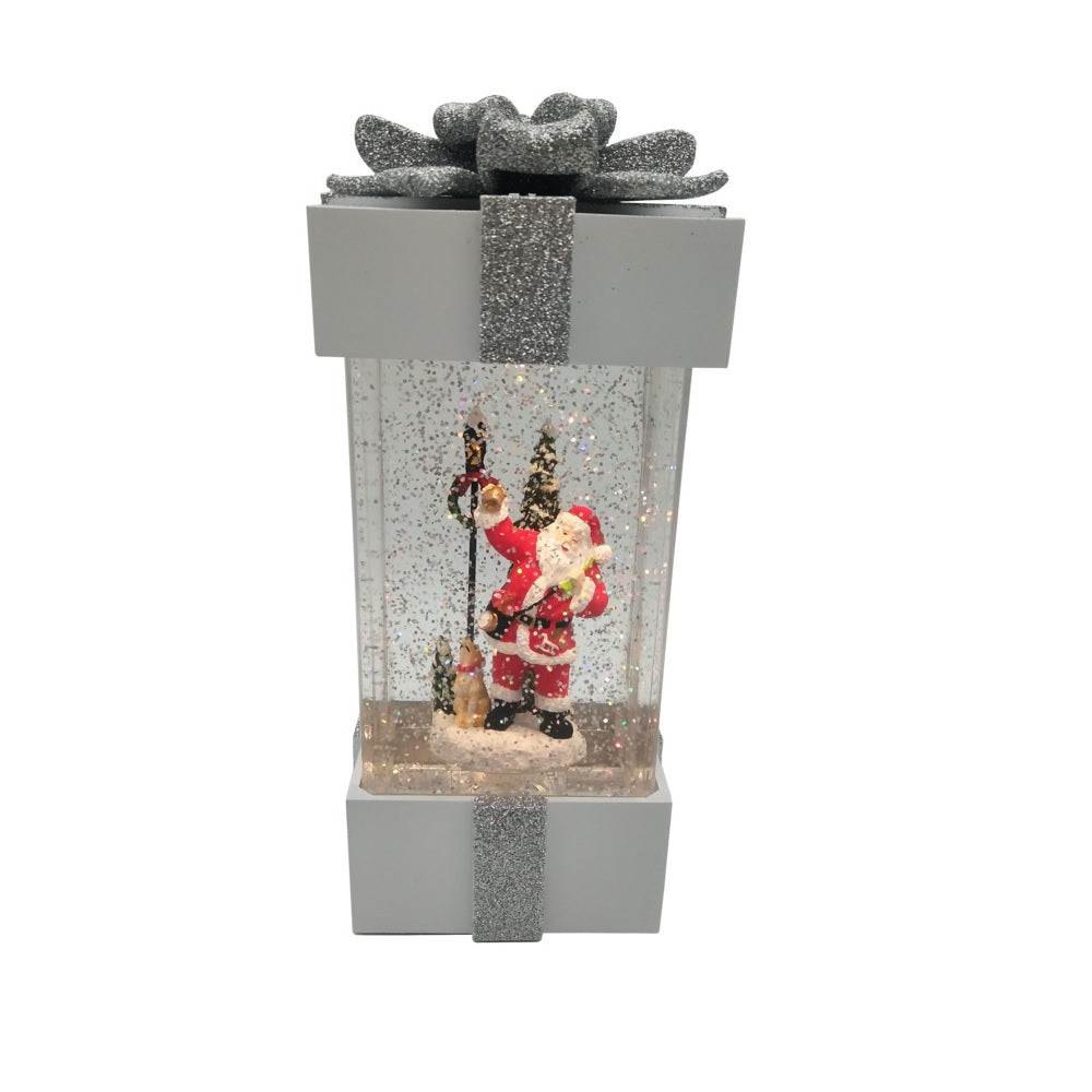 The prelit gift box has a Santa scene in the box