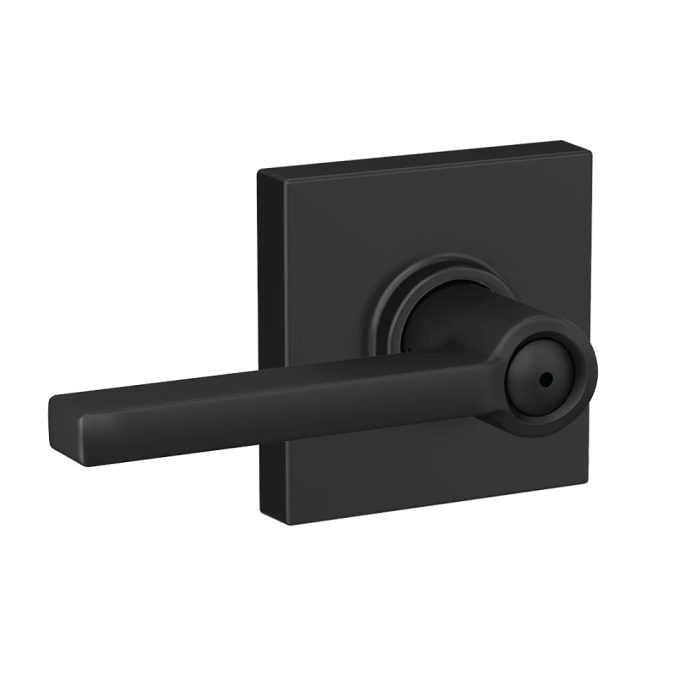 Pushbutton, privacy function automatically unlocks from the inside when the lever is rotated or from the outside in an emergency with the included pin key