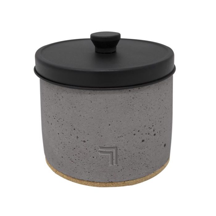 Highlights:Frame Finish: MatteFrame Color: GrayLid Color: BlackShape: RoundHeight: 3.38 inchDepth: 4 inchesWidth: 4 inchesHousing Material: ConcretePo