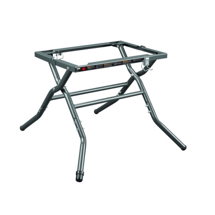 Tool-less latches quickly secure the table saw and an adjustable leg makes leveling simple