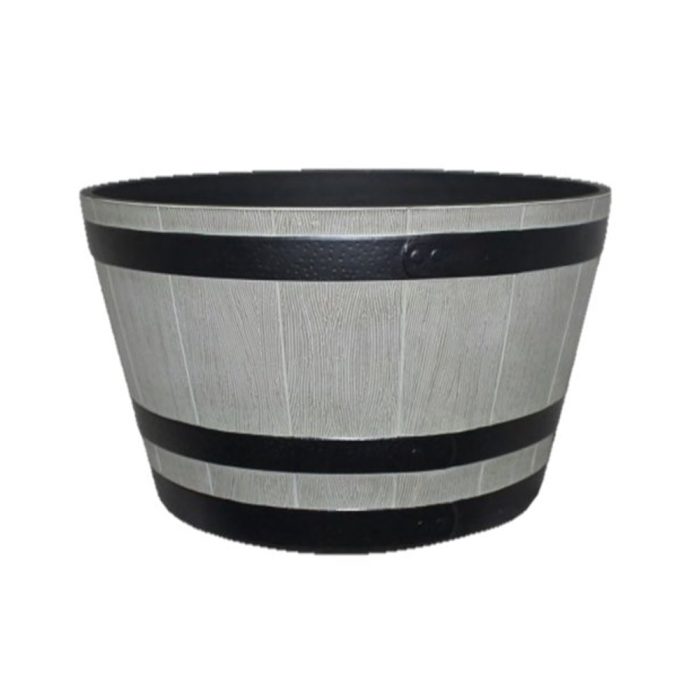 A resin construction creates a lightweight and durable planter that lasts longer than traditional wooden barrels