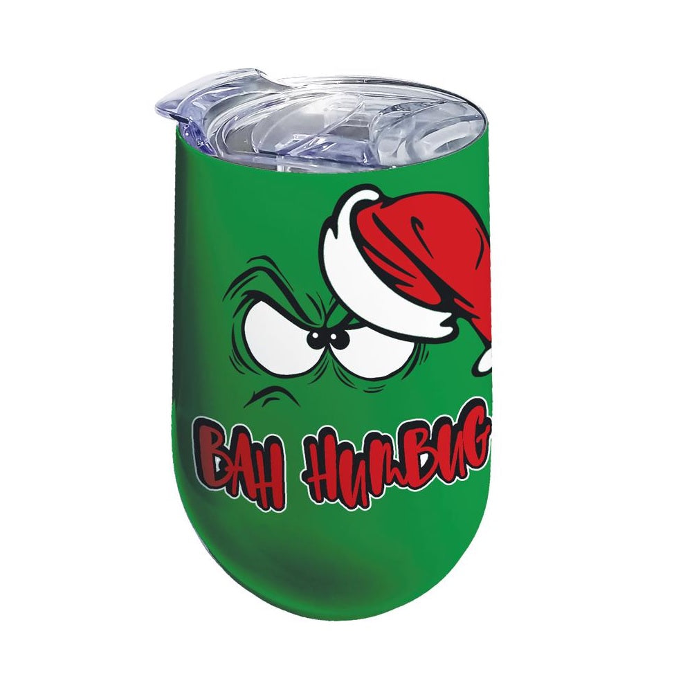 Highlights:Color: GreenMaterial: Stainless SteelCapacity: 16 OunceTheme: Bah HumbugDesign: Wine Tumbler Bah HumbugChristmas Motif: Santa HatLength: 3.