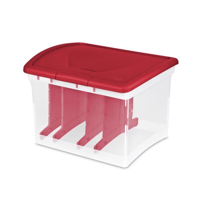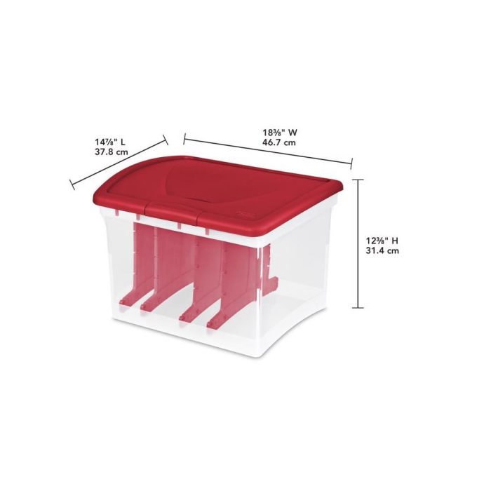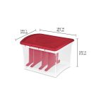 Highlights:Color: Clear/RedMaterial: PolypropyleneHeight: 12.38 inchWidth: 18.38 inchDepth: 14.88 inchStackable: YesCube: 5.3 Cubic FeetBPA-free and p