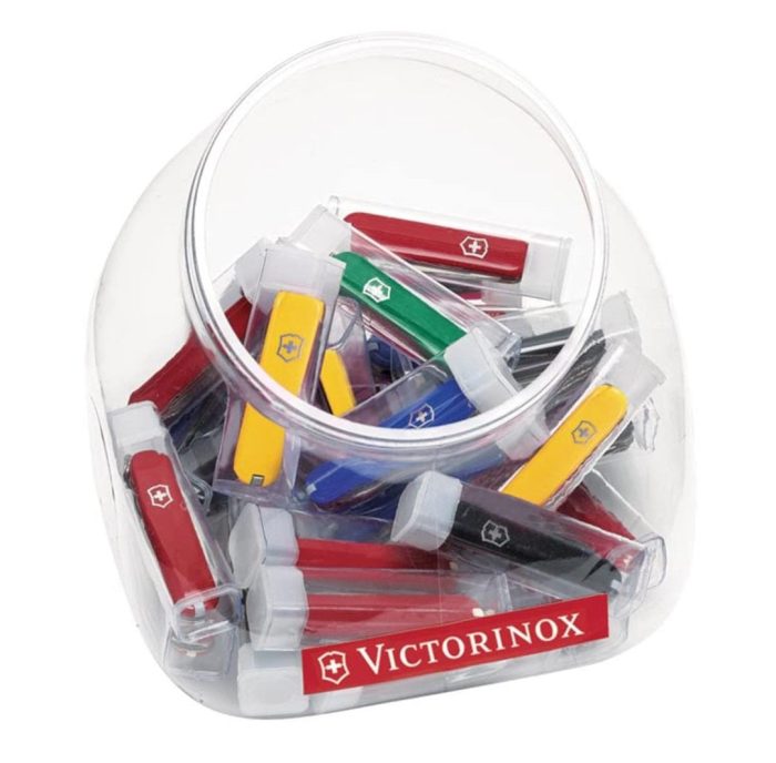 Highlights:Closed Length : 2-1/4 inchColors: (10) red), (8) black, (4) blue, (4) yellow and (4) greenCandy jar full of army knivesFor pocket or purseF