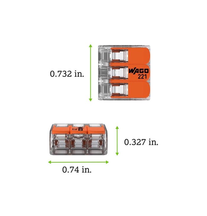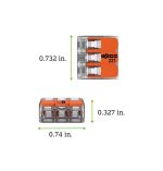 Highlights:Connector Type: 3 Port LeverNumber in Package: 50 pkUL Listed: YesCompatible Wire Range: 24/12 AWGHeight: 0.327 inchLength: 0.74 inchWidth: