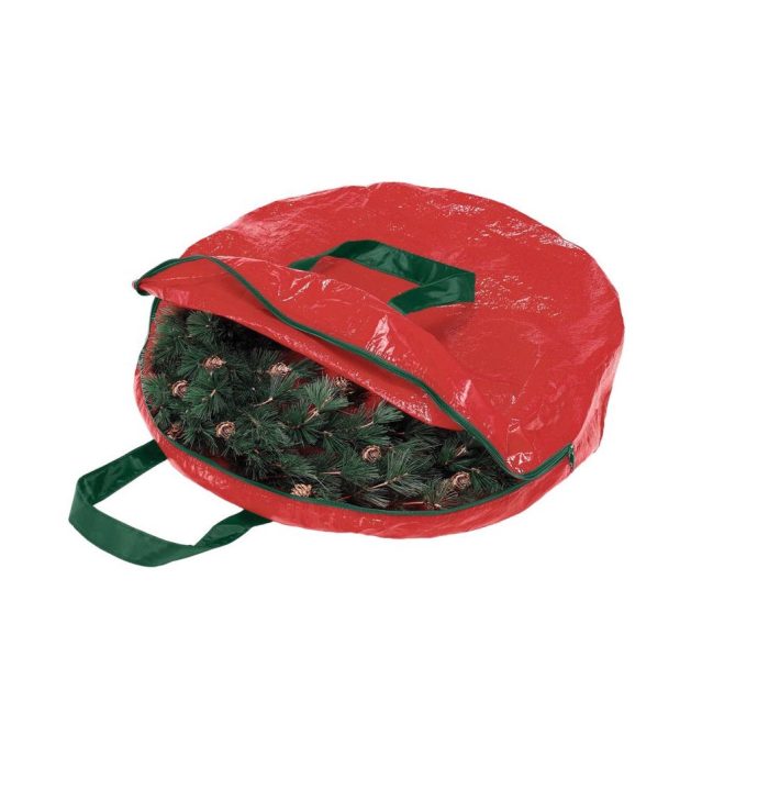 Whitmor’s wreath and garland bag is a circular shape, made to fit your seasonal wreath for storage during the off-season